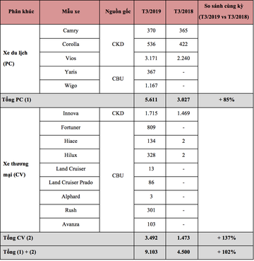 Toyota Việt Nam (TMV) công bố tổng doanh số bán hàng trong tháng 3/2019 đạt con số kỉ lục 9.103 xe (không bao gồm xe Lexus), tăng 102% so với cùng kỳ năm ngoái, nâng thị phần của TMV lên 37% (tăng 7% so với cùng kì năm 2018, trong đó 4 mẫu xe: Vios, Innova, Wigo và Fortuner cùng nằm trong top 10 mẫu xe bán chạy nhất VAMA.