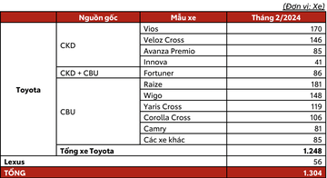 Công ty Ô tô Toyota Việt Nam công bố tổng doanh số bán hàng trong tháng 2/2024 đạt 1.304 xe (bao gồm xe Lexus).