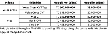 Từ tháng 3, khách hàng có thể sở hữu xe Toyota Vios và Veloz Cross dễ dàng hơn với chương trình điều chỉnh giá bán. Toyota thông báo giá bán lẻ mới, giảm tối đa lên tới 38 triệu đồng với mẫu xe Veloz Cross và 47 triệu đồng với mẫu xe Vios.