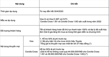Chào hè 2023. hệ thống đại lý Toyota trên toàn quốc tiếp tục triển khai chương trình khuyến mại dành cho khách hàng mua xe Vios và Corolla Cross trong tháng 4 với thông tin cụ thể như sau: