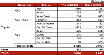 Công ty Ô tô Toyota Việt Nam công bố tổng doanh số bán hàng trong tháng 3/2023 đạt 5.848 xe (bao gồm xe Lexus), đứng đầu thị trường xe du lịch.