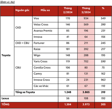 Công ty Ô tô Toyota Việt Nam công bố tổng doanh số bán hàng trong tháng 3/2024 đạt 3.973 xe (bao gồm xe Lexus), đứng đầu thị trường xe du lịch.