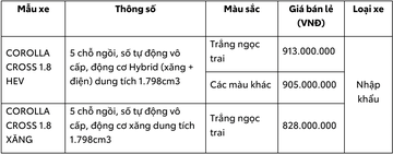 Bên cạnh đó, mẫu xe Corolla Cross là mẫu xe duy nhất có sự giảm nhẹ về số lượng, do phiên bản nâng cấp 2024 của Corolla Cross sẽ được ra mắt vào ngày 06/05/2024 này với những thay đổi đáng kể về ngoại thất và tính năng tiện ích, và có giá bán lẻ như sau: