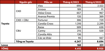 Công ty Ô tô Toyota Việt Nam công bố tổng doanh số bán hàng trong tháng 4/2023 đạt 4.415 xe (bao gồm xe Lexus), đứng đầu thị trường xe du lịch.