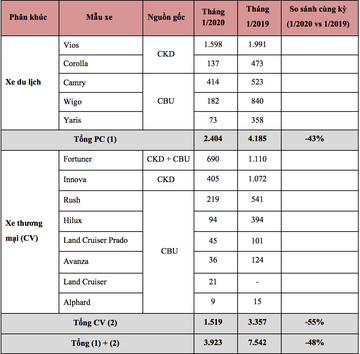 Công ty Ô tô Toyota Việt Nam (TMV) công bố tổng doanh số bán hàng trong tháng 01/2020 là 3.923 xe (không bao gồm xe Lexus), giảm 48% so với cùng kỳ năm ngoái. Mẫu xe Vios và Fortuner tiếp tục nằm trong top các mẫu xe bán chạy nhất thị trường.