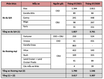 Công ty Ô tô Toyota Việt Nam công bố tổng doanh số bán hàng trong tháng 07/2021 đạt 3.689 xe (bao gồm xe Lexus), giảm 33% so với cùng kỳ năm trước trong khi tổng thị trường giảm 36% (tháng 07/2020) do ảnh hưởng bởi dịch Covid-19 đang diễn biến ngày càng nghiêm trọng hơn.