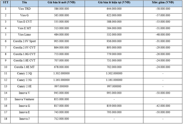 Theo đó, các sản phẩm mà TMV tiến hành điều chỉnh giá bán ở đợt này bao gồm hai mẫu sedan Vios và Corolla Altis cùng chiếc MPV 7 chỗ Innova. Mức giảm sẽ có sự khác biệt tùy theo phiên bản, cụ thể như sau:
