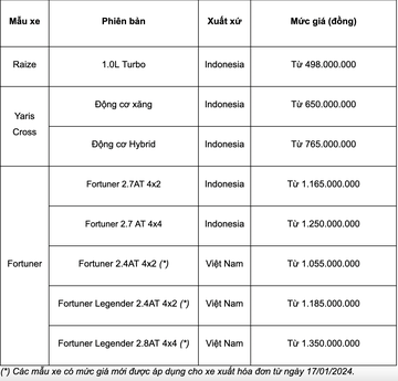 Nhân dịp chào đón năm mới, Toyota Việt Nam áp dụng mức giá mới dành cho một số mẫu xe (giá đã bao gồm Thuế Giá trị gia tăng 10%) và dành cho các xe xuất hóa đơn từ ngày 02/01/2024. Thông tin cụ thể như sau: