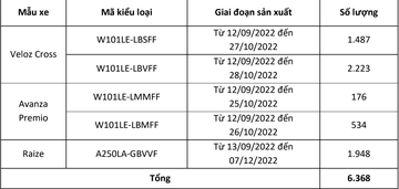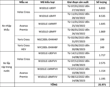 Chương trình sẽ được Toyota Việt Nam thực hiện chính thức từ ngày 19/01/2024 tại tất cả các Đại lý Toyota trên toàn quốc. Danh sách và số lượng xe tại Việt Nam bị ảnh hưởng cụ thể như sau: