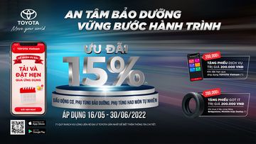 Với triết lý “Khách hàng là trọng tâm của mọi hoạt động”, từ 16/05 đến 30/06/2022, Công ty Ô tô Toyota Việt Nam và hệ thống đại lý Toyota trên toàn quốc thực hiện chương trình ưu đãi dịch vụ “An tâm bảo dưỡng – Vững bước hành trình” nhằm tri ân khách hàng đã luôn tin yêu và đồng hành cùng Toyota trong suốt thời gian qua.