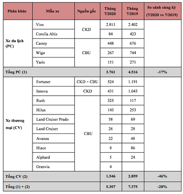 Trong tháng 7 vừa qua, doanh số các mẫu xe nhập khẩu của Toyota đạt 1.598 xe. Đứng đầu danh sách xe CBU là mẫu Camry với mức doanh số là 448 xe. Đặc biệt, doanh số mẫu xe Rush tăng gần 180%, đạt 325 xe, ghi nhận tháng thứ 6 liên tiếp doanh số tăng trưởng so với cùng kỳ năm 2019. Tiếp theo là các mẫu xe: Wigo đạt 267 xe, Yaris đạt 151 xe và Hilux đạt 143 xe.