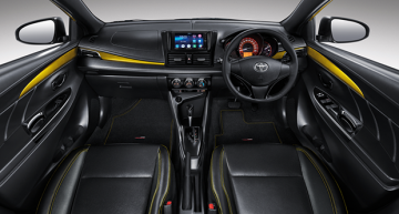 Không gian nội thất nổi bật bởi các đường chỉ khâu màu vàng tương phản trên các hàng ghế màu đen và thảm lót chân, bảng điều khiển và cửa trước cũng có các vệt vàng chạy dài nổi bật. Xe trang bị màn hình cảm ứng 7 inch, tích hợp chức năng giải trí lẫn hiển thị hình ảnh từ camera lùi hỗ trợ tài xế đỗ xe, ghế và vô-lăng bọc da, chìa khóa thông minh, hệ thống âm thanh 2DIN, kết nối Bluetooth và các thiết bị ngoại vi.