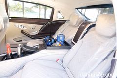 Khoang hành khách phía sau rộng rãi với 2 ghế thương gia siêu rộng, có thể ngả tối đa về phía sau lên đến 43,5°, tích hợp đệm đỡ bắp chân, đỡ chân điều chỉnh điện cùng chức năng massage 6 chế độ, bao gồm 2 chế độ massage chườm đá nóng. Xe còn được trang bị bộ bàn làm việc với cơ cấu gập thông minh, tiện lợi. Hành khách cũng có thể nâng ly cho những khoảnh khắc đáng nhớ với 2 ly champagne bằng bạc được chế tác thủ công bởi Robbe & Berking cùng những giọt rượu quý lấy từ hộc lạnh phía sau.