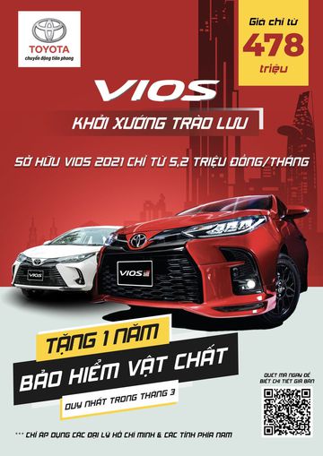 Từ ngày 20 đến 21.3.2021, tại Trung tâm Thương mại Takashimaya, Tp Hồ Chí Minh sẽ diễn ra Triển lãm giới thiệu các mẫu xe Toyota Vios phiên bản mới. Đặc biệt, khách hàng mua xe Vios trong tháng 3 được tặng 1 năm bảo hiểm vật chất, chỉ áp dụng tại các đại lý Tp. Hồ Chí Minh và các tỉnh phía Nam.