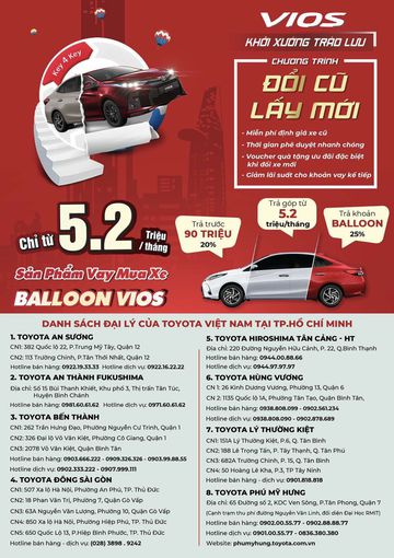 Để giúp khách hàng hiện thực hóa giấc mơ sở hữu xe Vios 2021, Công ty Tài chính Toyota Việt Nam (TFSVN) giới thiệu gói hỗ trợ tài chính hấp dẫn “Balloon”. Khách hàng có cơ hội sở hữu xe Vios 2021 chỉ với số tiền thanh toán ban đầu từ 95 triệu Đồng và số tiền trả hàng tháng trung bình chỉ với 5.2 triệu Đồng/tháng.
