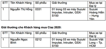Căn cứ kết quả bốc thăm vào ngày 01/03, Công ty TNHH Việt Nam Suzuki sẽ liên hệ khách hàng xác nhận phần thưởng. Phần thưởng sẽ được Suzuki vận chuyển đến Đại lý nơi khách hàng mua xe, sau đó Đại lý sẽ thực hiện việc trao thưởng cho khách hàng từ ngày 06/03/2021 – 26/03/2021.