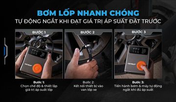 Bơm lốp công suất cao: Đa dạng chế độ bơm – Tự động ngắt thông minh. Kích bình ắc-quy 12V, dòng khởi động 1000A – 2000A, tương thích mọi dòng xe trên thị trường Việt Nam: Xe điện, xe động cơ dầu diesel lên đến 5.0L, xe động cơ xăng lên đến 8.0L