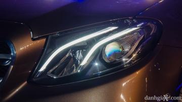 Phần đầu xe E300 AMG giờ đây được nâng cấp hệ thống đèn chiếu sáng hiện đại hơn. Cụ thể, hệ thống đèn định vị được tạo hình uốn lượn như bộ “mi mắt” chạy dọc theo hết chiều dài phền đèn xe. Hệ thống chiếu sáng này được trang bị toàn bộ các bóng LED tiên tiến. Khu vực lưới tảng nhiệt mang 2 thanh ngang mạ chrome “nâng đỡ” logo ngôi sao 3 cánh cỡ lớn cũng sáng bóng không kém. Một điểm mang nhiều nét thể thao trên E300 AMG chính là phần cản trước mang 2 hốc trang trí được tạo hình ấn tượng và mạnh mẽ.
