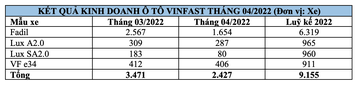 Công ty TNHH Kinh doanh Thương mại và Dịch vụ VinFast công bố kết quả kinh doanh ô tô tháng 04/2022, với tổng số 2.427 xe bán ra.