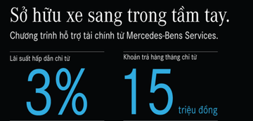 Đặc biệt, khách hàng có thể sở hữu ngay xe C 200 với mức trả góp hàng tháng chỉ 15 triệu đồng, hoặc xe E 200 với mức trả góp hàng tháng chỉ 21 triệu đồng thông qua chương trình hỗ trợ tài chính Mercedes-Benz. MBV sẽ hỗ trợ tài chính lãi suất ưu đãi (6% trong năm đầu tiên hoặc 8% trong hai năm đầu tiên) cho khách hàng mua xe C-Class, E-Class trong quý IV/2018, với hạn mức vay lên đến 90% giá trị xe, thời hạn vay có thể kéo dài 84 tháng và miễn phí thanh toán trước hạn.