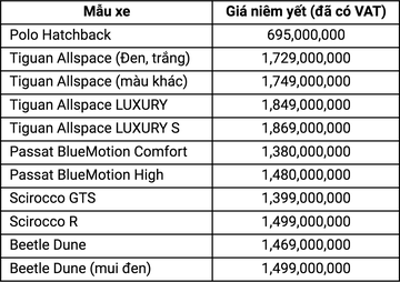 Bên cạnh đó, Volkswagen Việt Nam cũng công bố bảng giá xe mới nhất: