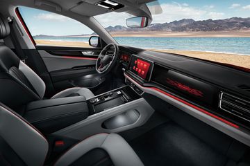 Gói thể thao R-line trên Teramont X mang dấu ấn thời thượng đến với phân khúc xe SUV đến từ Đức. Điểm nhấn thiết kế phối màu đen đồng điệu từ viền cản xe, mâm xe cho đến giá nóc mang đến ấn tượng mạnh cho sự bắt gặp lần đầu. Logo R mang tính thể thao xuất hiện trên lưới tản nhiệt, hai bên sườn xe và vô lăng. Má phanh được ốp màu đỏ nổi bật. Tương phản tạo dấu ấn là điểm mạnh trên Teramont X với logo VW có hiệu ứng phát sáng đặt tại chính diện trung tâm.