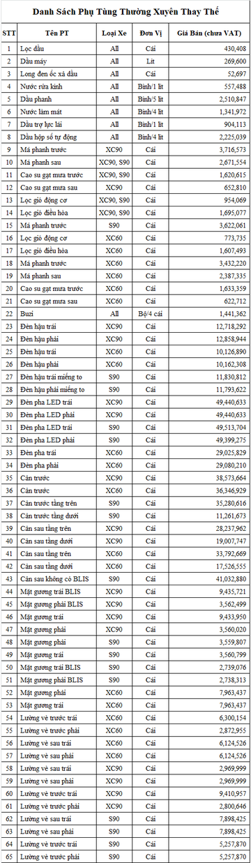 Cụ thể, danh sách giá bán các phụ tùng phụ kiện dành cho các mẫu xe Volvo hiện đang phân phối chính hãng tại Việt Nam gồm S90, All New XC60 và XC90 như sau: