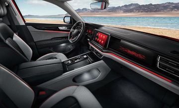 Bên trong khoang nội thất, Teramont X được trang bị màn hình trung tâm 12 inch và bảng đồng hồ kỹ thuật số sau vô lăng kích thước 10,25 inch cùng màn hình HUD. Ngoài ra còn phải kể đến dàn âm thanh Harman Kardon gồm 12 loa, công suất 700W, cửa sổ trời toàn cảnh, phanh tay điện tử, sạc không dây, đèn trang trí nội thất,...