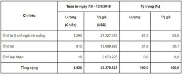 Trong tuần từ ngày 7/9 - 13/9/2018, lượng ô tô nguyên chiếc các loại đăng ký tờ khai hải quan đạt 1.928 chiếc, tương ứng tổng trị giá đạt 43,37 triêu USD, giảm 14,8% so với lượng nhâp khẩu trong tuần trước.