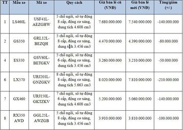 Bảng giá bán lẻ mới của các mẫu xe Lexus đã bao gồm thuế giá trị gia tăng (VAT) cụ thể như sau: